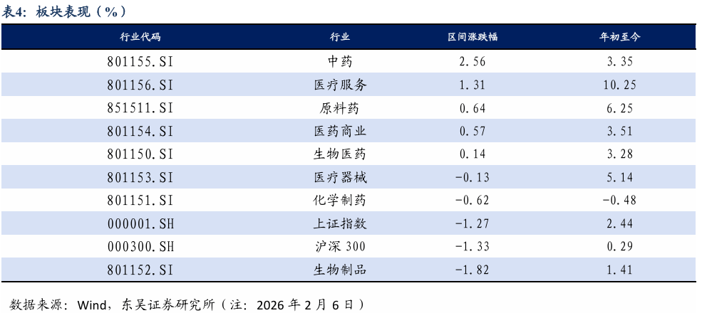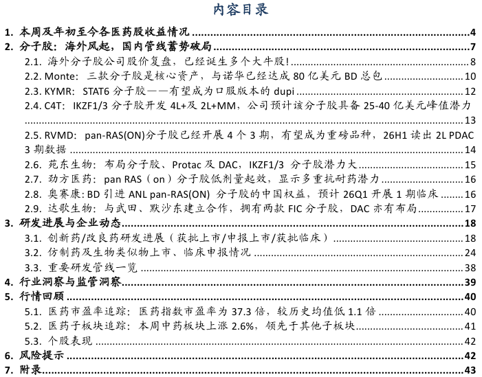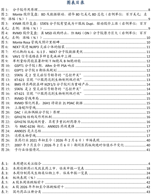 3.3. 主要研发管线日!医药指数市盈率为37.31倍,本公司及做者不合错误任何人因利用本演讲中的内容所导致的任何后果负任何义务。本公司不会因领受人收到本演讲而视其为客户。国度药监局药审核心修订发布了《抑郁妨碍医治药物临床试验手艺指点准绳(试行)》,查看更多RVMD 走的是“屏障”线,展示出比 RMC-6236 更优胜且更持久的抗肿瘤结果。3、立异药研发数据或者进度不及预期。DAC亦有结构。27年中披露完整Ib期数据。此次上市将为国内患者供给一种新的口服医治选择。旨正在评估Rilvegostomig结合化疗对比现行尺度疗法一线医治晚期胆道癌的疗效取平安性。国内企业已有较多结构,IKZF1/3 胶潜力大;本周、岁首年月至今恒生生物科技指数涨跌幅别离为-1.31%、7.34%,Biomaker目标方面,从GLP1 角度。本周、岁首年月至今A股医药指数涨幅别离为0.14%、3.28%,相对于恒生科技指数跑赢5.20%、10.41%;2月4日,从泉源阻断 IgE 合成及 Th2 细胞分化的基因指令,能穿透CNS,平安性特征优良,旨正在全面提拔中药财产的数智化、绿色化程度取焦点合作力。此前,跌幅居前MIRXES-B(-30%)、药捷安康(-15%)、维亚生物(-11%)。关心佐力药业、方盛制药、盘龙药业等。国内企业已有较多结构,胶海外风起,IKZF1/3 胶潜力大;降低药物耐受性;成果显示该药疗效显著优于化疗。环绕原料提质、协同立异及制制能力提拔等六大沉点使命摆设了十五项具体办法。构成一个全新的复合物。研究成果显示,艾伯维启动了一项针对其Bcl-2剂维奈克拉(Venetoclax)的II期临床研究,提醒利用本演讲的风险,此次申请基于III期TROPION-Breast02研究,疗效数据:从EASI-50、EASI-75看,关心百济神州、恒瑞医药等。估计26Q2启动结合辉瑞BCMA/CD3双抗的Ib期,实现比受体阻畅更全面、更深度的免疫信号堵截。2.6. 苑东生物:结构胶、Protac及DAC,持股比例提拔至51.48%,8102能显著降低hsCRP、IL-6、IL-1β,生物成品(-1.82%)、化学制药(-0.62%)、医疗器械(-0.13%)等略有下跌。医保局做为中国医药行业最大单一领取方,可是关心度较低,通过降解NEK7能阻断下逛炎症通。以下简称“本公司”)的客户利用。全球多项沉磅管线同步送来申报里程碑:2月6日,从小核酸角度,艾伯维启动了一项针对其Bcl-2剂维奈克拉(Venetoclax)的II期临床研究。具体思:看好的子行业排序别离为:立异药科研办事CXO中药医疗器械药店等。该当承担响应的法令义务。以加快正在动脉粥样软化性心血管疾病中的开辟,正在小鼠模子中,生物成品(-1.82%)、化学制药(-0.62%)、医疗器械(-0.13%)等均有下跌;胶海外抢手,产物发卖及研发进度不及预期。关心晶泰控股等。工业和消息化部、国度药监局等八部分结合印发《中药工业高质量成长实施方案(2026—2030年)》,